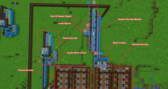 In the beginning of this venture of creating a internet from scratch in Minecraft we started by simply broadcasting the payloads without any traffic control. Compared to a normal TCP/IP packet, this packet looks severely lacking in features but the idea was to reduce the amount of overhead in a packet because as it stands right now, the header takes 1.6 seconds to send and the payload takes 3.2 seconds to send. The amount of time it would take to send a TCP packet wouldn’t be worth all the nice features. You may have noticed that there is reserved space in the packet and this is for future expansion of the packet such as designated flags for certain applications. In the future, there will be a actual internet, besides the global packet control system, everything is peer to peer which has its disadvantages.