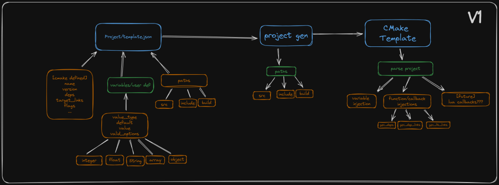 programatically. This quickly becomes pretty unmanageable and you want to have the ability have to endless extensibility. Some of the ideas from this sketch make it to the next round like the idea of user-defined data structures. The biggest feature that we provide is the ability to create lua macros to help generate the CMake file.